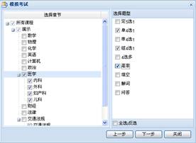 先选择专业、课程,再选择欲练习的内容和题型,下一步定义每种题型的数量与分数。